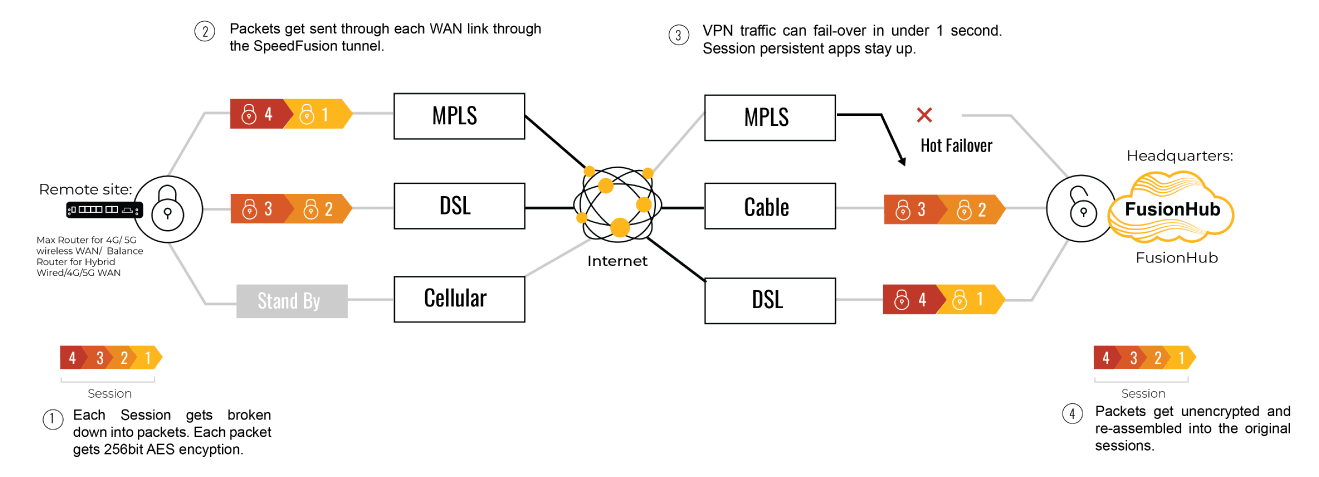 Once the bandwidth bonded SpeedFusion tunnel is formed, sessions are broken down, and the resulting packets are sent separately across as available WAN-to-WAN connections. Because each WAN-to-WAN connection is encrypted separately, potential hackers would need to obtain the key to every WAN-to-WAN connection before they stand a chance of accessing the data contained within. This makes SpeedFusion SD-WAN technology virtually impervious to man-in-the-middle attacks.
